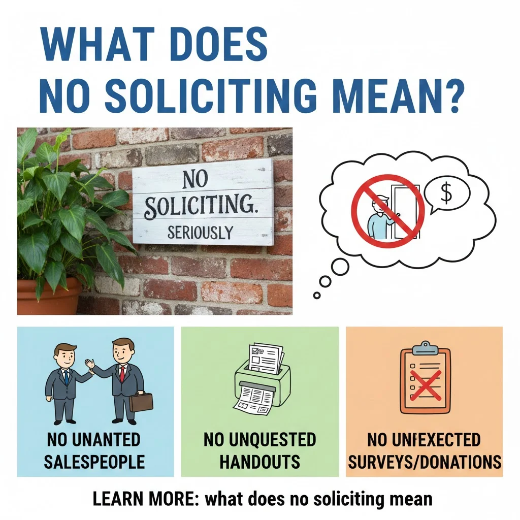 “No Soliciting” is a simple way for homeowners and businesses to protect their space, time, and privacy. It blocks unwanted sales, promotions, surveys, and fundraising visits. Understanding what the sign means helps you act respectfully and avoid uncomfortable situations. Whether you’re delivering, visiting, or running a business, recognizing these boundaries makes communication smoother and more polite. If you ever see a “No Soliciting” sign, assume the person wants peace and privacy—and honoring that shows professionalism and courtesy.